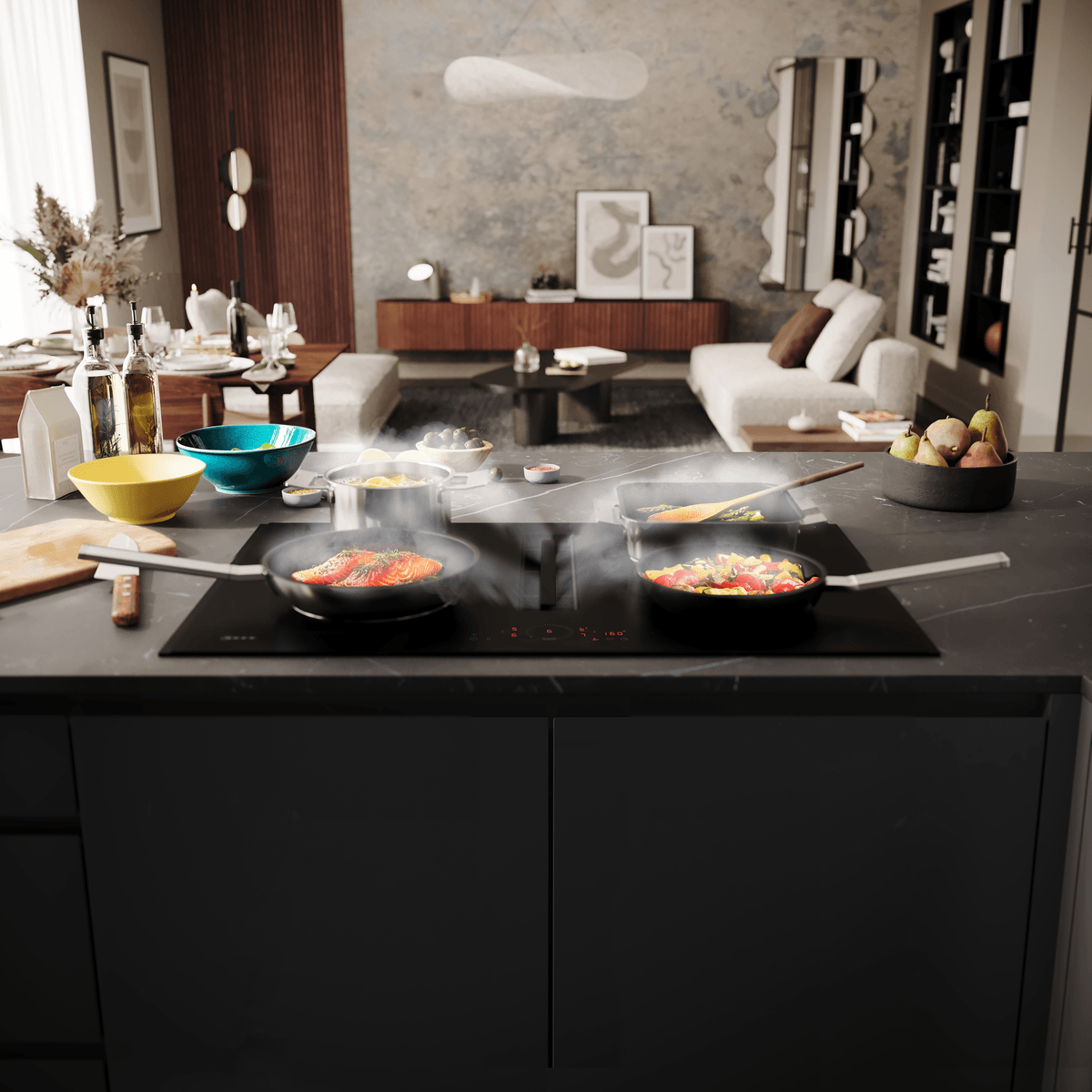 Die neuen Induktionskochfelder und Kochfeldabzüge von Neff erscheinen in mattschwarzer Glaskeramik. Die Oberfläche reduziert sichtbare Fingerabdrücke und Kratzer und wirkt gleichzeitig ruhig und modern. Die 80 Zentimeter breiten Varianten verfügen über XL-Flexzonen, die bis zu 25 Prozent zusätzliche Kochfläche schaffen. Die Induktion erkennt Form und Position des Kochgeschirrs automatisch und passt die Heizfläche an, sobald ein Topf verschoben wird. Gesteuert werden die Kochfelder über Twist Touch, einen digitalen Leuchtring, der per Fingertipp oder Drehbewegung präzise Leistungsstufen einstellt.